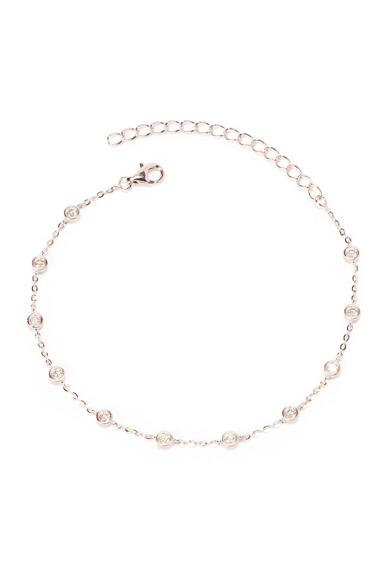 White rhodium finished silver chain bracelet with 11 bezel set white topaz quartz jewels. Bracelet measure 6.5'' length + 1'' extender chain. Forever timeless, we love these layered with our favorites. Made with love and intention for feel good moments.