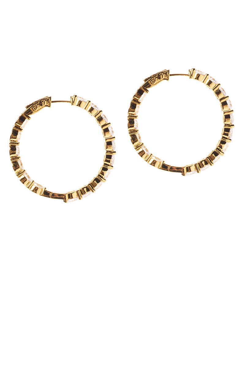 14k gold finished prong set 5mm perfect white topaz quartz crystal double eternity hoop earrings. Safety lock closure. {Hoop diameter measures 1.4''}.