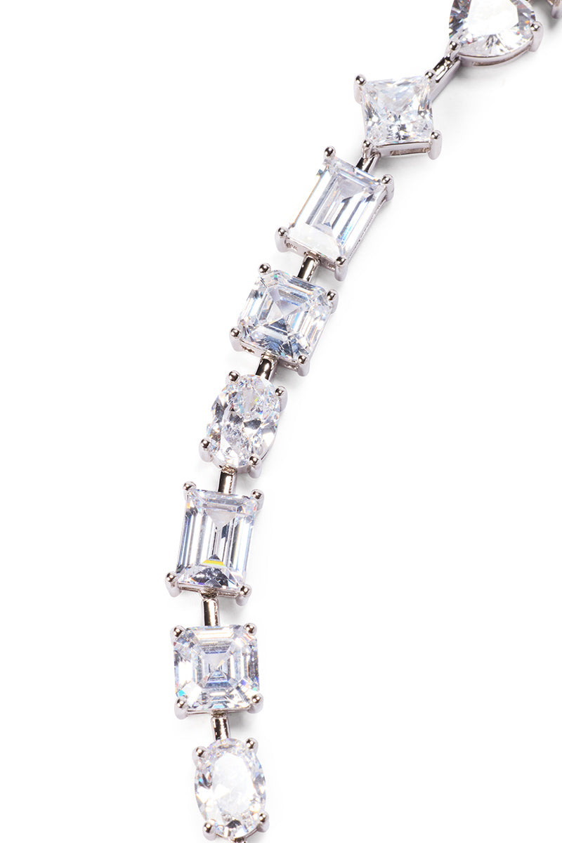 16'' white rhodium finished multi shaped prong set carbon finished white topaz crystal quartz tennis necklace. Necklace features emerald, heart, marquise, and oval-cut stones. Safety lock closure.