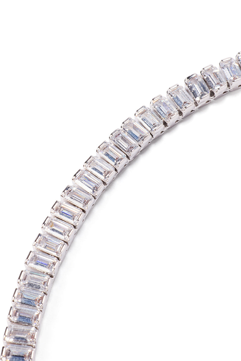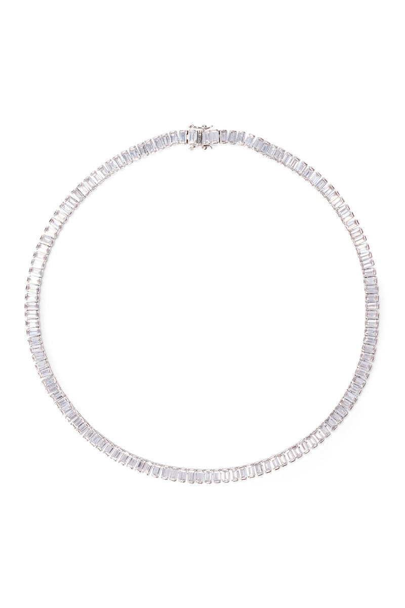 16'' white rhodium finished graduated bezel emerald cut white topaz crystal quartz tennis necklace. Necklace features step bezel set emerald stones. Safety lock closure.
