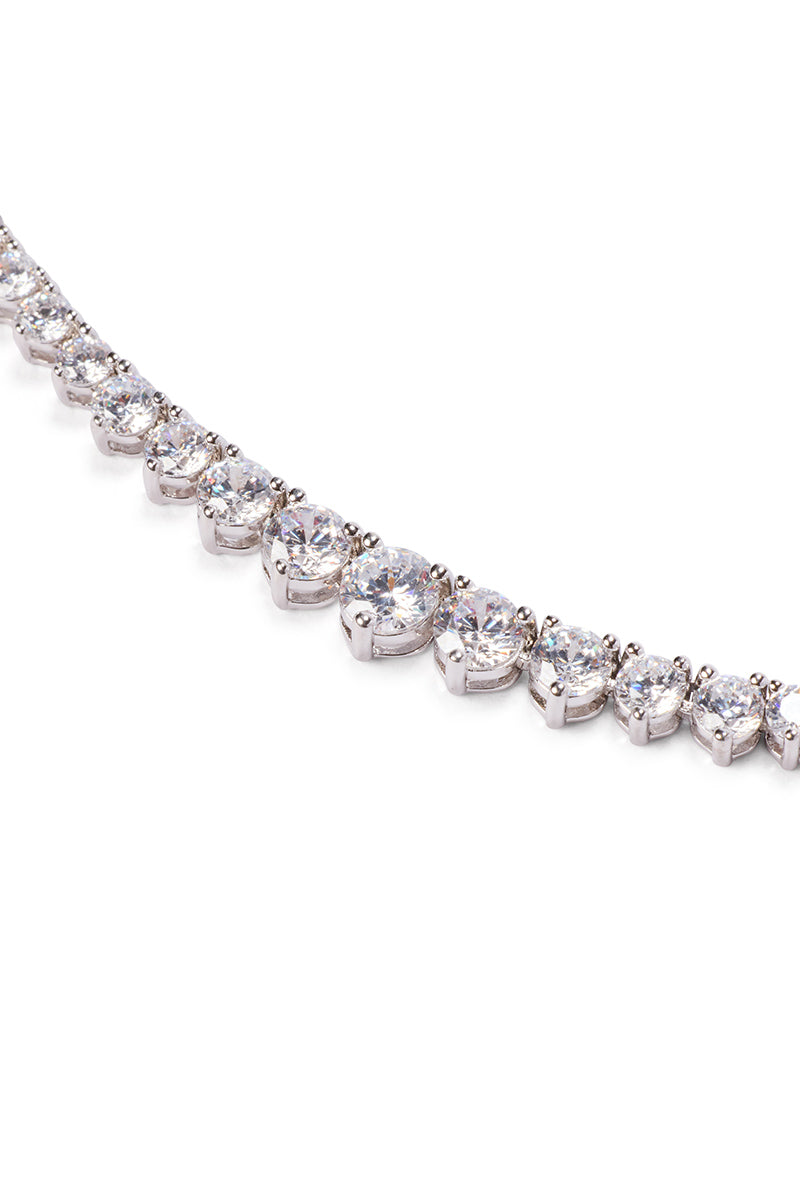16'' white rhodium finished graduated three prong set carbon finished white topaz crystal quartz tennis necklace. Safety lock closure. {Stones measure 2.5mm-5.mm}. Made for love and dreams and layering.